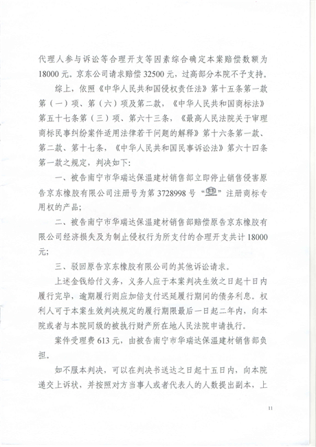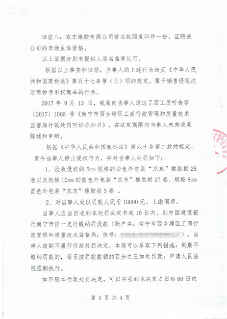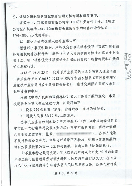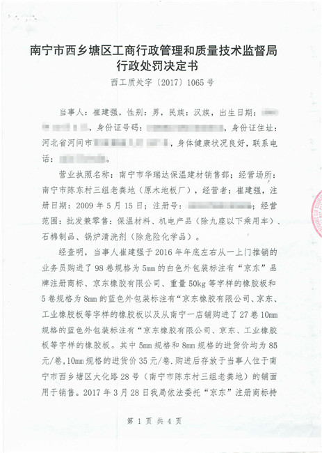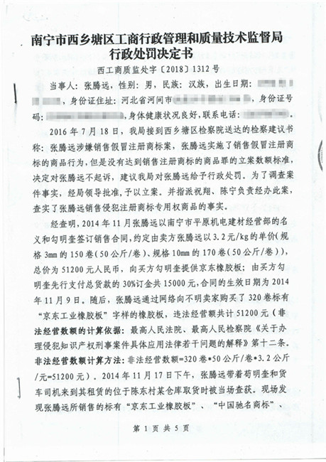 截止到2018年11月份,廣西南寧西鄉(xiāng)塘區(qū)工商行政管理和質(zhì)量技術(shù)監(jiān)督局對(duì)假冒我公司商標(biāo)侵權(quán)行為進(jìn)行行政處罰:崔建強(qiáng)[西工質(zhì)處字(2017)1065號(hào)] 10000元;張騰遠(yuǎn)[西工商質(zhì)監(jiān)處字(2018)1312號(hào)] 75500元。全部上繳國(guó)庫(kù)。并對(duì)這兩起案件我公司也進(jìn)行了司法賠償判決。